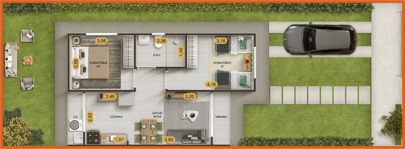 Empreendimento Habitacional denominado “Condomínio Residencial Villaggio Orquídeas” da Matrícula nº 122.022, do 5º do Registro de Imóveis de Cuiabá/MT. CRECI Jurídico 29614, registrado em 10/03/2025. Sujeito à análise de crédito. Imagens meramente ilustrativas. Decoração, móveis e jardinagem não inclusos.